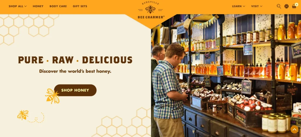Asheville Bee Charmer stands out for its colorful, story-driven design that celebrates both the art and science of honey. Their website beautifully blends eCommerce functionality with storytelling, offering visitors a journey into the world of bees and local honey production. From Sourwood Honey to Honey Gift Boxes, every product page feels natural, warm, and honest. The visuals are bright yet rustic, aligning perfectly with the brand’s “mountain charm.” Their blog and product descriptions are optimized for keywords like raw honey and infused honey, helping them rank organically while building customer trust.
