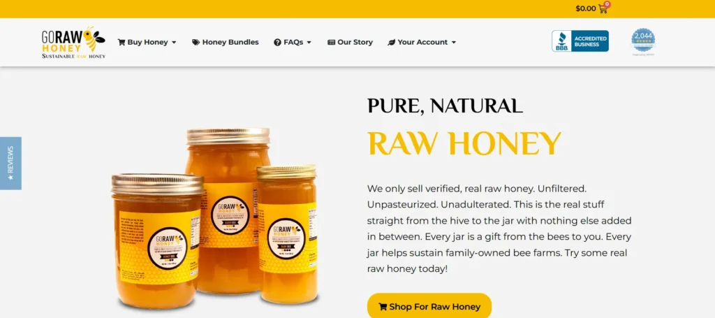 Go Raw Honey takes the minimalist approach — the website design is clean, white, and product-focused. They highlight the purity of their honey with strong calls to action like “Unfiltered. Unheated. Unprocessed.” Each jar comes with transparency about origin, ingredients, and harvesting methods, appealing to customers searching for 100% natural honey or chemical-free honey online. Their site uses a simple Shopify-style layout with trust badges and clean fonts that emphasize purity and health. It’s a textbook example of how simplicity can elevate perceived quality in eCommerce.