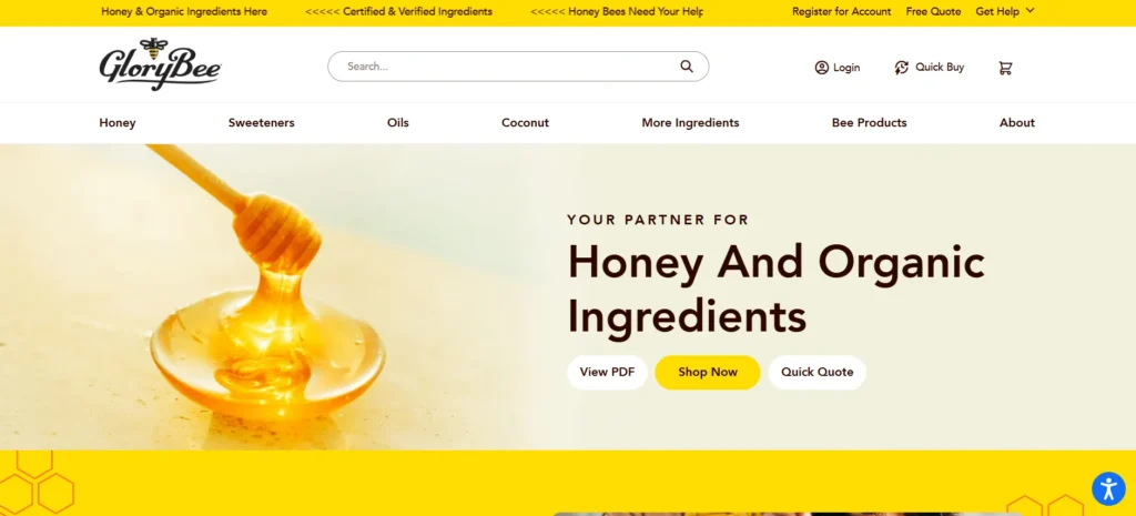 GloryBee has been a leader in honey and natural ingredients for decades, and their website demonstrates professionalism and range. They cater to both retail customers and wholesale buyers with clear product segmentation — organic honey, raw honey, and bulk honey. The navigation is user-friendly, and sustainability messaging is woven throughout the pages. Their “Save the Bee” campaign stands out, showcasing a socially responsible brand identity. This combination of ethical sourcing, strong SEO structure, and clean product layout makes GloryBee one of the most trusted honey websites online.